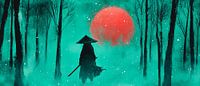 In een mystieke schemering rijst een mysterieuze figuur, getooid met een traditionele hoed, op voor een felrode zon. De mist omhult het silhouet van het landschap, dat doet denken aan legendes uit het Verre Oosten. Deze fascinerende compositie voegt een artistiek tintje toe aan elke woonkamer en stimuleert de verbeelding terwijl het rust uitstraalt.