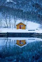 Koop dit landschapskunstwerk Eenzame hut bij een fjord in Øye, Norangdal, Noorwegen van qtx als print op canvas, aluminium dibond, (ingelijste) fotoprint, behang en ArtFrame. Voor jou op maat geprint in Fine-Art kwaliteit.