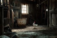 In deze sfeervolle foto staat een witte kip in een vervallen, oude schuur, die baadt in het zachte, binnenvallende licht. Het verweerde hout en de roestige metalen voorwerpen stralen een nostalgische sfeer uit, die doet denken aan het landelijke leven van vroeger. De schuur ademt karakter met zijn doorleefde materialen en subtiele details. De kip, ogenschijnlijk de enige bewoner, brengt een gevoel van rust en eenvoud. Perfect voor liefhebbers van landelijke fotografie en rustieke charme, deze foto zou prachtig staan in een interieur dat warmte en authenticiteit wil uitstralen.