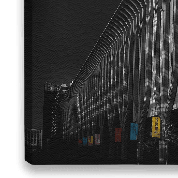In de nabewerking heb ik het geheel in zwart wit omgezet, behalve de reclame vlaggen aan de gevel. Omdat de donkere tinten overheersen is het een…