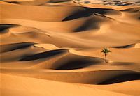 Eenzame palmboom in zandduinen. Sahara woestijn. Grote Oosterse Zandwoestijn in Algerije