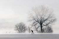 Nederland, Wapenveld, eenzame schaatser schaatst op de ondergelopen en bevroren uiterwaarden van de IJssel rivier. Zwanen en meerkoeten genieten van een nog open wak.
