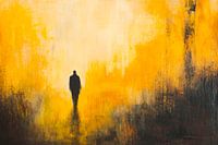 Een mysterieuze schaduw dwaalt door een gouden zee van licht, het schilderij straalt een rustgevende warmte uit. De zachte overgangen tussen geel en donker geven de kamer een betoverende diepte. Perfect voor de woonkamer om gesprekken te verrijken en een uitnodigende sfeer te creëren.