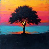 Een eenzame boom staat in silhouet tegen een levendige zonsondergang boven kalm water. Het scherpe contrast tussen de donkere boom en de vurige lucht creëert een krachtig en suggestief beeld dat veerkracht, vrede en de schoonheid van de cycli van de natuur suggereert. De getextureerde penseelstreken voegen diepte en een gevoel van…