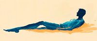 Een ontspannen silhouet ontvouwt zich in zachte blauwe en oranje tinten en straalt rust en sereniteit uit. De minimalistische lijnen en het harmonieuze kleurcontrast geven de kamer een modern tintje. Dit kunstwerk is perfect voor een slaapkamer of een ontspannende woonkamer, waar het de sfeer zal bepalen om te dagdromen.