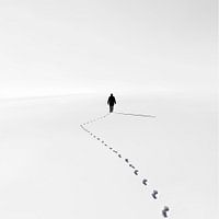 In het midden van een sneeuwwitte, eindeloze uitgestrektheid baant een eenzame figuur resoluut zijn weg. Zijn sporen contrasteren indrukwekkend met de gloeiend heldere achtergrond en lijken een verhaal van zoektocht en avontuur te vertellen. De uitgestrektheid en stilte van het scenario creëren tegelijkertijd een sfeer van eenzaamheid en vrijheid.
