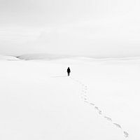 In deze indrukwekkende zwart-wit afbeelding dwaalt een eenzame figuur door een eindeloos, besneeuwd landschap. De glinsterende, witte uitgestrektheid wordt alleen onderbroken door het smalle pad van voetafdrukken dat haar stille reis documenteert. De foto straalt een diepe melancholie uit en benadrukt de eenzaamheid en oneindigheid van de natuur.