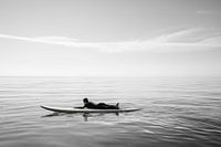 In de stilte van de eindeloze oceaan glijdt een donker silhouet zachtjes over het glinsterende wateroppervlak. Het monochrome landschap versterkt het gevoel van eenzaamheid en rust, terwijl de surfer roerloos op zijn board blijft zitten. Wolken wenken aan de horizon en de zachte golven lijken in harmonie met de rust van de natuur.