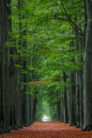 Het begin van de herfst begint zichtbaar te worden in deze prachtige bomenlaan in Gelderland. Het oranje tapijt van bladeren op de vloer van het bos en een eenzame tak volledig oranje steken af tegen de nog groene bladeren.