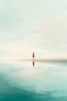 Een mystiek moment, gevangen in zachte pastelkleuren, voert de kijker mee naar een stille plek van bezinning. De helderrode figuur steekt indrukwekkend af tegen het kalme water en de mistige lucht. Deze afbeelding is ideaal voor een slaapkamer en creëert een rustgevende sfeer die uitnodigt om te dromen en te ontspannen.