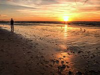 Strand bij Katwijk bij laag tij, met aangespoelde kokkels en een wandelaar.