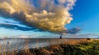 Een eenzame zeiler op een leeg Sneekermeer. De inmense wolken boven het meer maken van het Skûtsje een klein bootje