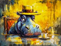Nijlpaard, hoed, koffie, koffiekopje, koffiepauze, geel, blauw, expressionisme, humor, parodie, plezier, dierenportret, café scene, moderne kunst, warmte, fantasie, ontspanning, gezellig, zachtaardig, sympathiek, grappig
