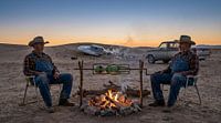 Dit werk is droog, absurd en messcherp tegelijk. Twee mannen zitten zwijgend tegenover elkaar bij een kampvuur in de woestijn. Geen paniek, geen sensatie. Gewoon stoelen, denim overalls, een pickup op de achtergrond — en tussen hen in: een alien aan een spit. Alsof dit al honderd keer eerder is gebeurd. Alsof dit precies is wat je doet…