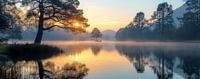 Dit kunstwerk toont een betoverende zonsopkomst boven een kalm meer, waar het eerste ochtendlicht zachtjes door de bomen breekt en reflecteert op het stille wateroppervlak.