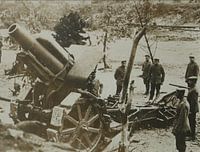 Foto uit de Eerste Wereldoorlog. Artilleriebemanning met kanon. Soldaten in uniform. Kanon uit de loopgravenoorlog. Mortier.