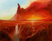 Dit schilderij geeft een krachtig en symbolisch beeld van de schepping en de oorsprong van de wereld. In het midden van het schilderij staat een majestueuze vulkaan, symbool voor het begin van de schepping. Deze vulkaan rijst op uit de aarde en herinnert ons aan de eerste scheppingsdag toen het licht de duisternis…