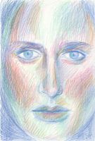 Tekening van een gezicht met lichte ogen in zachte pastelkleuren. Kleurpotlood.