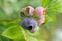 Eerste bosbessen van het seizoen - een tros bosbessen in verschillende stadia van rijpheid. De eerste bosbessen van het seizoen. Eén bes is bijna rijp en de rest van de tros is nog roze met op de achtergrond middelgroene bladeren.