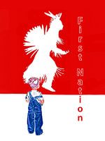 Poster van een klein meisje in blauwe jeans voor een afbeelding van een dansende indiaan met de inscriptie "First Nation".
