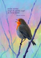 Koop dit vogel kunstwerk Eerste vogelzang van het jaar Haiku Nederlands van Karen Kaspar als print op canvas, aluminium dibond, (ingelijste) fotoprint, behang en ArtFrame. Voor jou op maat geprint in Fine-Art kwaliteit.
