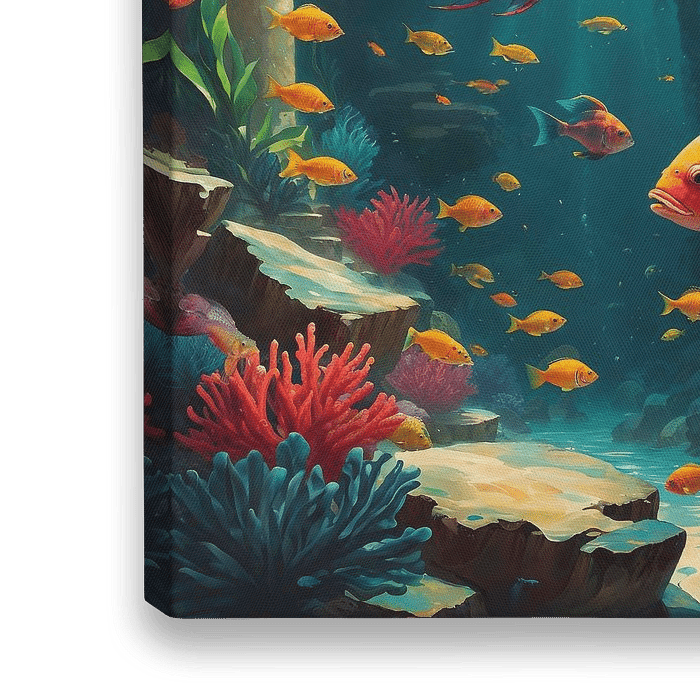 Dit werk toont een betoverende onderwaterwereld waar felle oranje vissen moeiteloos tussen eeuwenoude ruïnes zwemmen. De zonnestralen die door het water filteren, creëren een serene sfeer en benadrukken de levendige kleuren van het koraal en het mariene leven. De combinatie van realisme en surrealisme, met een vleugje romantische…