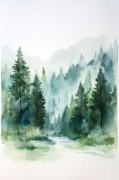 Het aquarel vangt de serene ambiance van een onaangetast natuurrijk, en nodigt de toeschouwer uit om de rijkdom van het groene landschap te ervaren. Deze creatie straalt zowel rust als verwondering uit, en eert de majesteit van de lariksbomen die het berglandschap bevolken.