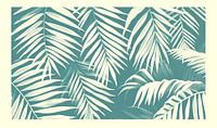 Dit trendy kunstwerk toont een verzameling palmbladeren die elegant tegen een zachtgroene achtergrond zijn afgebeeld.
