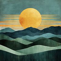 Een modern kunstwerk met een abstract landschap met bergen en een zon of maan, geïnspireerd op de tijdloze esthetiek van Japanse schilderkunst. Het geeft de kamer een krachtige maar ontspannen sfeer.