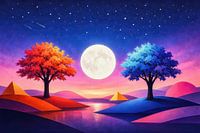 In het midden staat een enorme volle maan die als een centraal rustpunt dient. Aan weerszijden van de maan staan twee bomen op ronde heuvels, die elkaars spiegelbeeld lijken te zijn maar sterk verschillen in kleur: de linkerboom gloeit in warme tinten oranje en rood, terwijl de rechterboom straalt in koele tinten blauw en paars.