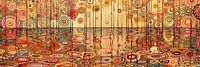 'Eeuwige Zonnewende' neemt u mee op een visuele reis naar een plek waar de tijd stilstaat en de zon eeuwig aan de horizon gloeit. Dit levendige tafereel is een ode aan de cycli van de natuur, met ritmische patronen die echoën naar oude tradities en ceremonies. De aardse tinten en organische vormen brengen een gevoel van verbondenheid met de aarde, terwijl de dynamische, bijna muzikale arrangementen van cirkels en lijnen de kijker verleiden tot reflectie en innerlijke rust. In deze wereld van eeuwige schemering bloeit de verbeelding, waarbij elk symbool een verhaal vertelt dat geworteld is in de rijke bodem van collectieve mythes en dromen.