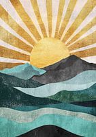 Een indrukwekkend abstract landschap met bergen en zon- of maanlicht, geïnspireerd op de helderheid en rust van Japanse schilderkunst. De stemming straalt zowel kracht als sereniteit uit.