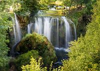 Deze foto toont een adembenemende waterval, omringd door weelderige groene vegetatie. Het water valt sierlijk neer in een natuurlijk gevormd bassin, waarbij de fijne nevel een etherische sfeer creëert. De weerspiegeling van het licht op het wateroppervlak en de zachte vloeiing van het water suggereren een moment van tijdloze rust. Deze opname illustreert niet alleen de schoonheid van de natuur, maar ook de artistieke kwaliteit van de foto, die de kijker een gevoel van vrede en sereniteit geeft.