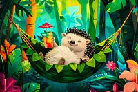 Een vrolijk ontwerp van een schattige egel die ontspannen in een groene hangmat ligt, omringd door kleurrijke tropische planten. Deze unieke illustratie straalt een zorgeloze, tropische sfeer uit en is perfect om een ruimte op te vrolijken. Het gebruik van heldere kleuren en speelse details maakt het ideaal voor kinderkamers, creatieve werkruimtes of plekken waar een ontspannen en vrolijke uitstraling gewenst is. Dit design past perfect bij liefhebbers van natuur en dieren en is een blikvanger in elke ruimte.