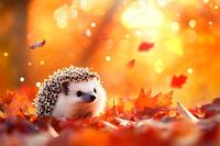 Het betoverende schouwspel van een kleine egel ontvouwt zich te midden van gloeiende herfstbladeren die zachtjes dansen in de wind. Met zijn stekelige rug en nieuwsgierige ogen beweegt hij zich in het gouden licht dat de wereld om hem heen betovert. Een moment van rust, gevangen in de magische kleuren van de natuur.