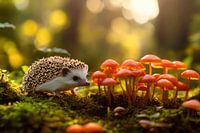 In het zachte ochtendlicht kruipt een kleine egel door het met mos begroeide kreupelhout. Zijn stekelige pantser contrasteert met de feloranje paddenstoelen die als kleine lantaarns uit de grond schieten. Het vredige tafereel straalt een bijna magische sfeer uit waarin natuur en dierlijke nieuwsgierigheid harmonieus samensmelten.
