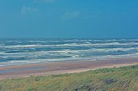 Vanaf de boulevard in Egmond aan Zee genomen foto van een ruige zee. Vier lagen: lucht, zee, strand en duingras. Natuur en weer en luchten. Lekkere frisse wind in de zomer. Licht stormachtig weer aan de kust van de Noordzee.