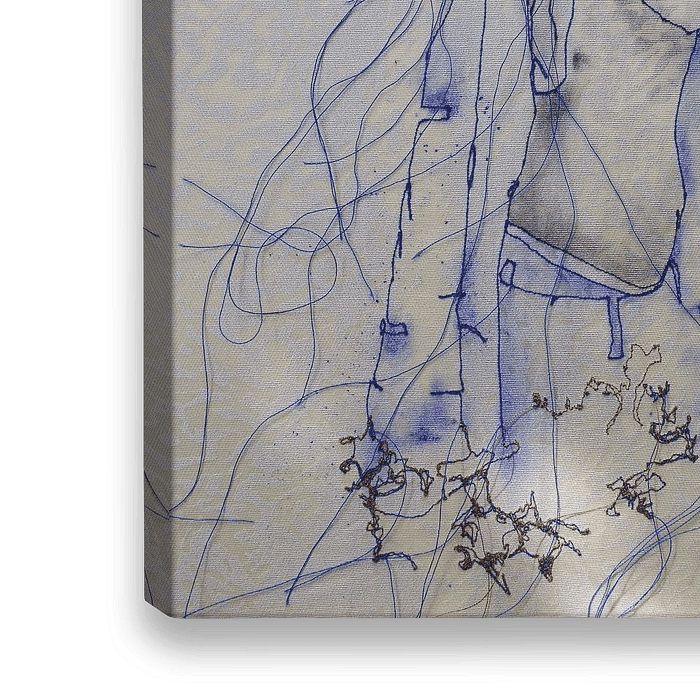 Een figuratief werk van een vrouw met doek, in blauw & bruin draad op textiel. Een touch van houtskool & een vleugje zon.