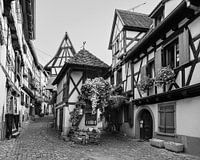 Een 4:5 zwart-wit foto van een zomeravond aan het beroemde straatje met de zo herkenbare vakwerkhuizen in het dorp Eguisheim, gelegen in de Franse Elzas.