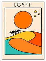 Digitale tekening/illustratie van een landschap in Egypte met zandduinen en dromedarissen. Met bijpassende kleuren en in een retro jasje. Leuk als poster of in een lijst voor in de kamer, kantoor of wachtruimte.