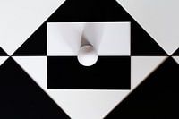 Een ei in een abstracte omgeving met zwarte en witte rechthoeken en driehoeken.