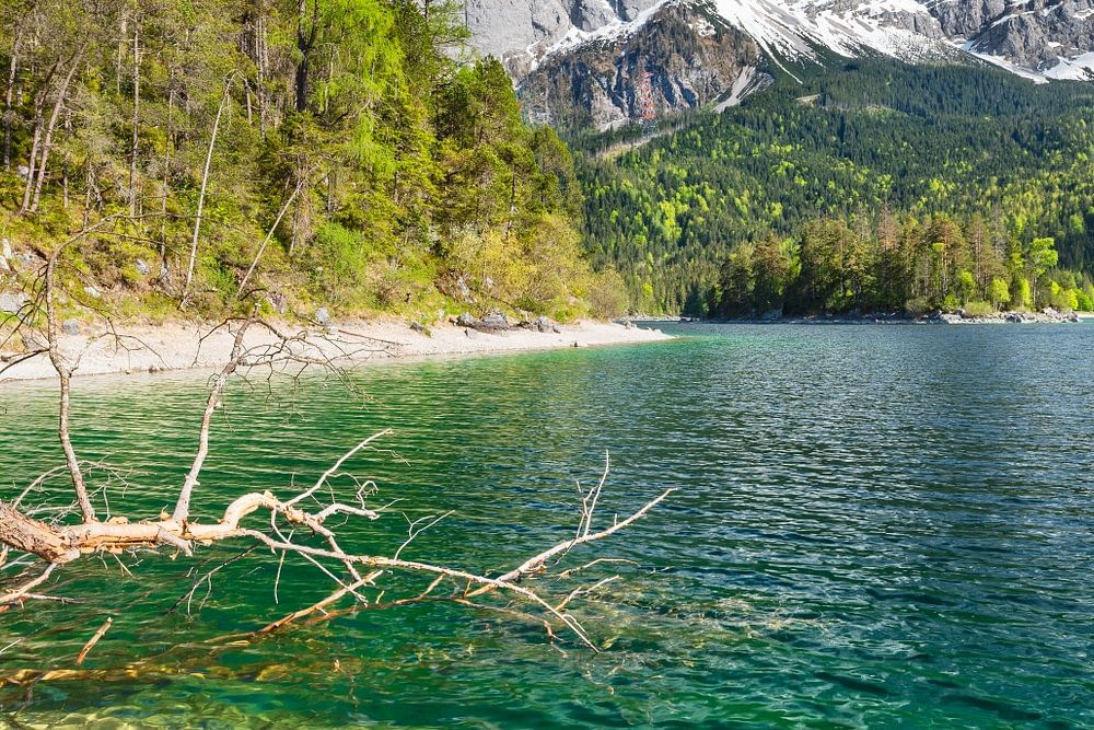 Turquoise bergmeer op een zonnige zomerdag voor de met sneeuw bedekte Felsberg. Eibsee, Zugspitze, Beieren, Duitsland, Europa