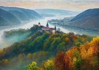 Een prachtig uitzicht vanaf Eichfelsen bij Inzigkofen in de valleien van de Donau op een mistige herfstochtend. Mist hangt over de kronkelende rivier en de beboste hellingen en creëert een mystieke sfeer. De gouden tinten van de herfstbladeren piepen door de mist, terwijl het zachte ochtendlicht de diepte en rust van het landschap…