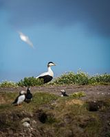Een prachtig mannetje eidereend liet zich mooi zien tussen de papegaaiduikers en andere zeevogels voor de Engelse kust. Dat leverde dit mooie beeld op.