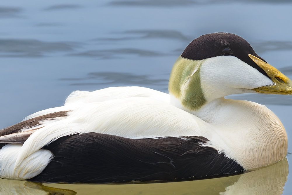 Het water weerspiegelt de serene omgeving, terwijl de eidereend met krachtige slagen voortbeweegt. Zijn sierlijke houding en vloeiende bewegingen creëren een harmonieus beeld van natuurlijke elegantie. De kleurschakeringen van zijn veren, variërend van donker naar licht, contrasteren subtiel met de weerspiegeling van de lucht in het kalme water.