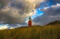 De foto toont een ruig beeld met dreigende regenwolken en helmgras in de harde zeewind.