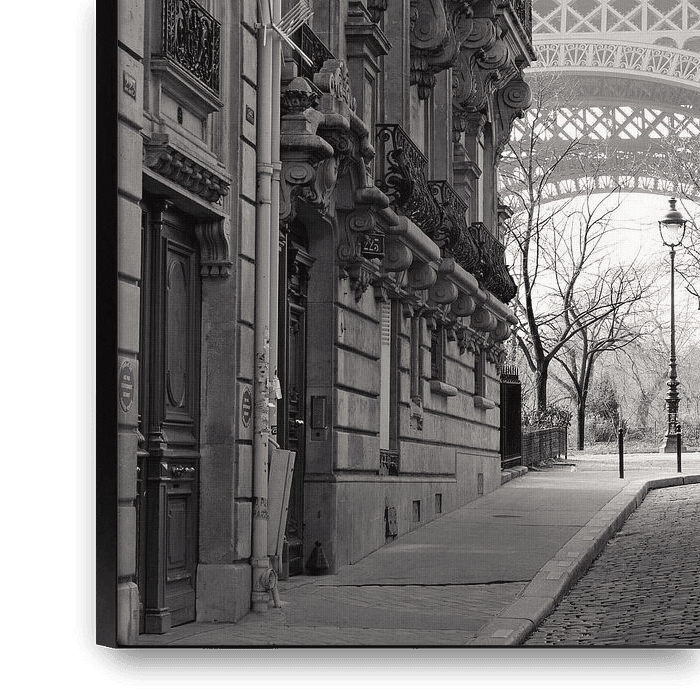 The Eiffel Tower photographed on a sunny morning from rue de l'Université near the Champs de Mars.