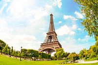 De Eiffeltoren in Parijs op een zonnige zomerdag. Op de voorgrond de parken van het Marsveld op de achtergrond de turquoise zomerlucht.