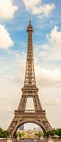 De Eiffeltoren in Parijs tegen een prachtige zomerse hemel. Op de achtergrond het Marsveld en de militaire school