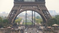 Prachtige close-up opname van de onderkant van de Eiffeltoren in Parijs, Frankrijk, met alle bedrijvigheid rondom de toren